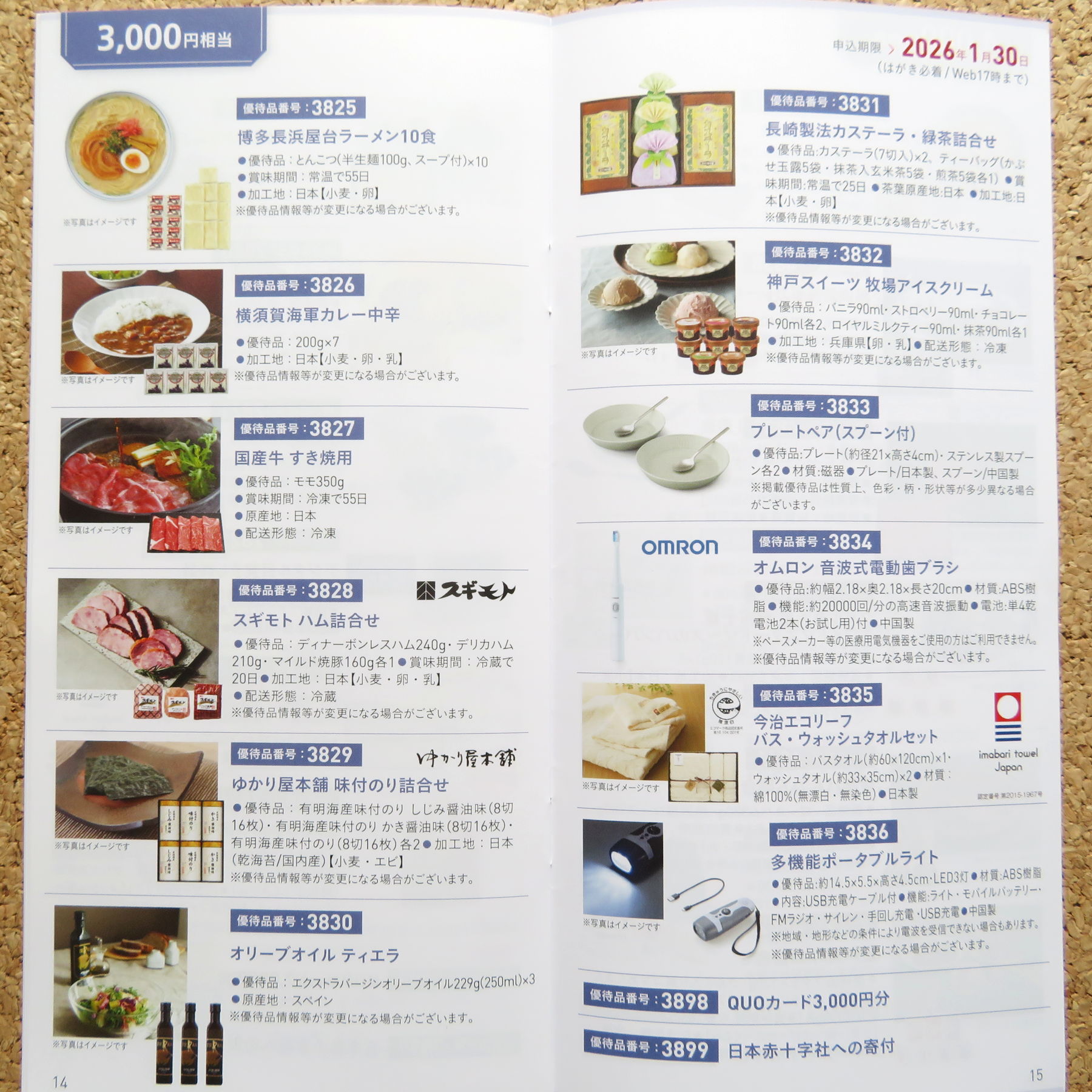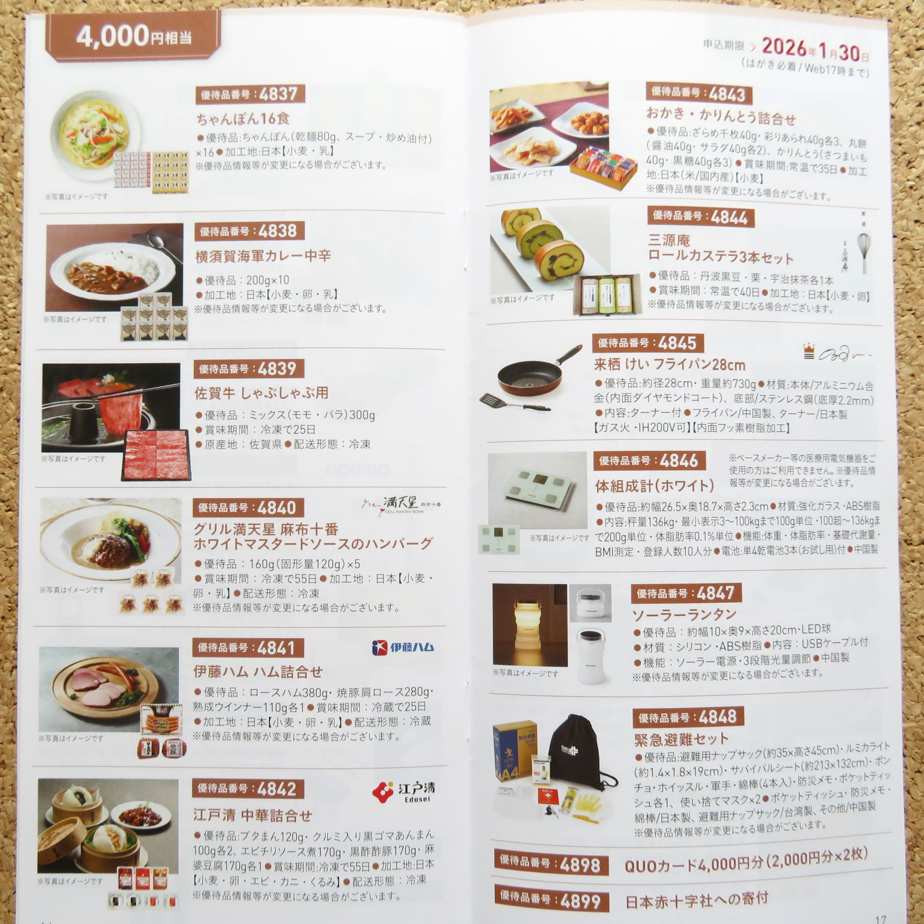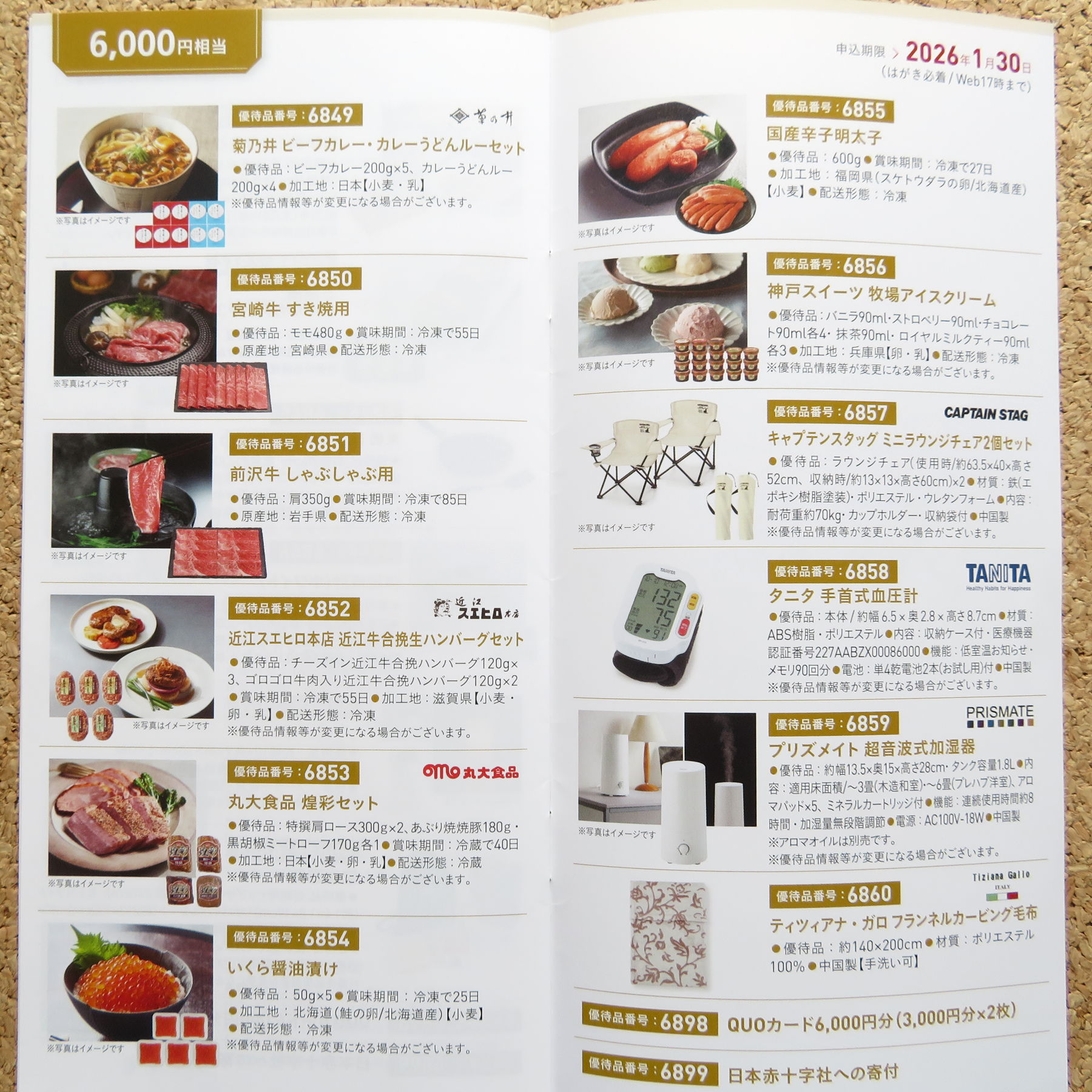 カタログは15ページで、1,000円~6,000円相当まで各12商品+寄付+クオカードです。